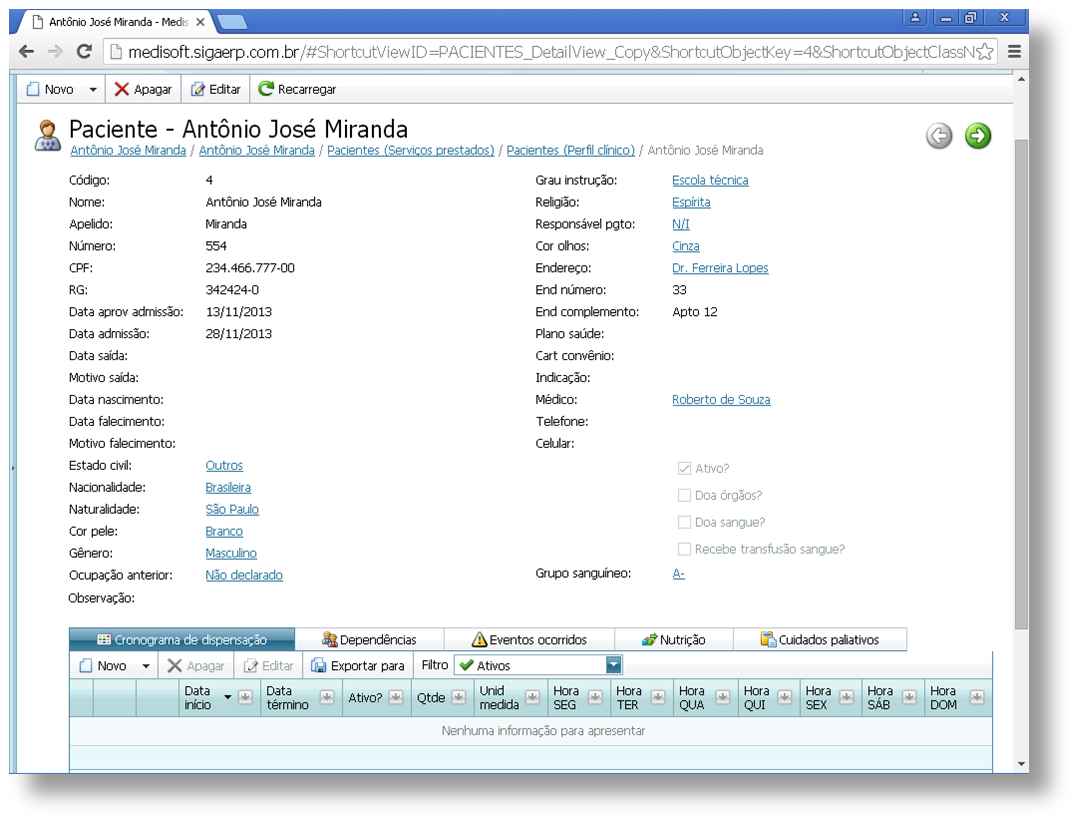 Informação relacionada: A partir da grade, clique na linha desejada, evitando os "links" na cor azul, para apresentar uma nova tela com informação relacionada ao perfil clínico: Cronograma de dispensação, Dependências, Eventos ocorridos, Nutrição e Cuidados paliativos.